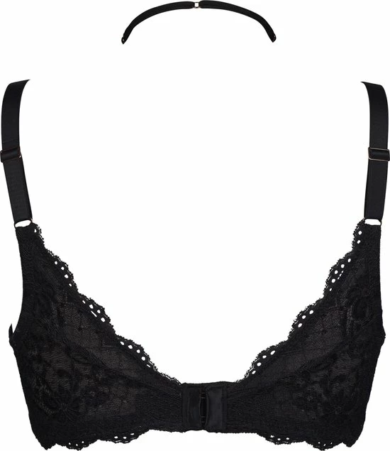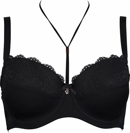 Een voorgevormde zwarte beugel bh. Deze bh is afgewerkt met kant schuin over de cup, tussen de cups zit een strikje met een stras steentje. De achterkant van de bh is geheel van kant. Voorgevormd met beugel, optionele strap naar de nek; verstelbare schouderbandjes; haak- en oogsluiting achterzijde 4×3 haaks.