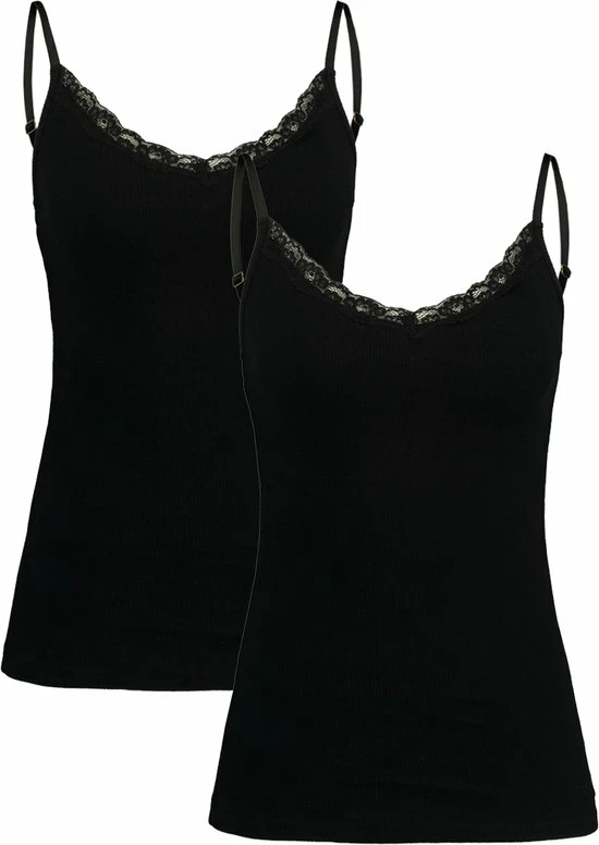America Today singlet 2-pack voor dames. De Grace 2-pack is een set van twee basic singlets, voorzien van een v-hals, met kant afgewerkte randen rondom de hals, verstelbare spaghettibandjes en deze uitvoering is gemaakt van 95% biologisch katoen.