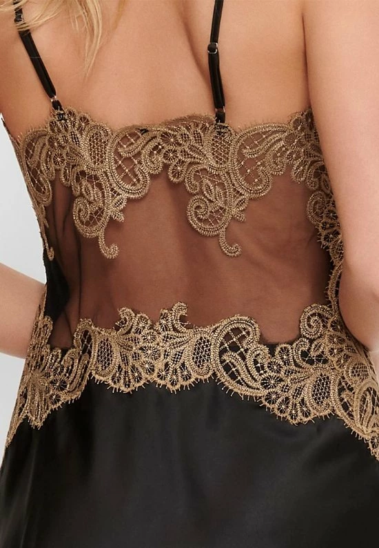Dit luxe negligβΒ© is afgewerkt met mooi goudkleurig kant en heeft een soepel vallende pasvorm. De achterzijde is deels doorzichtig en een echte blikvanger! Het materiaal is een zachte satijnachtige stof en het negligβΒ© heeft verstelbare bandjes. Combineer het met de bijpassende kimono uit dezelfde serie voor een complete look.