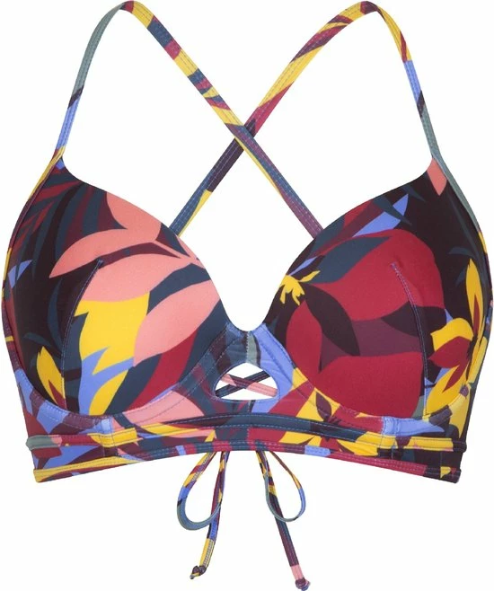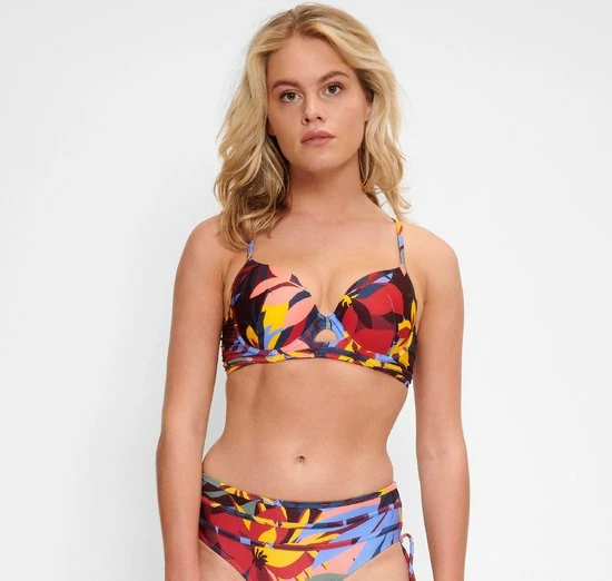 Bright Leaves Flower up your closet! Deze fleurige serie is geinspireerd op een van onze bestsellers vorig jaar. Met deze heldere kleuren straal je op het strand! De voorgevormde bikini top heeft tussen de cups een cut-out en sluit doormiddel van touwtjes op de rug. Op de achterkant kruisen de schouderbandjes elkaar voor een speels effect.