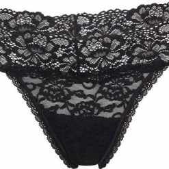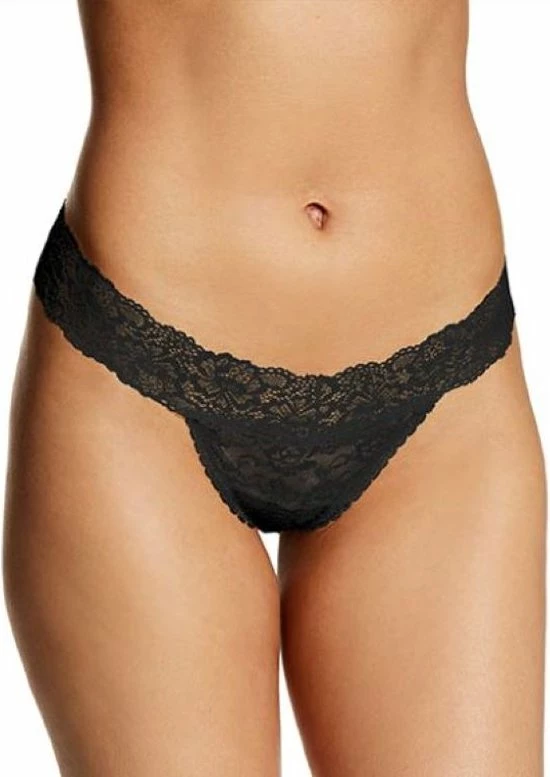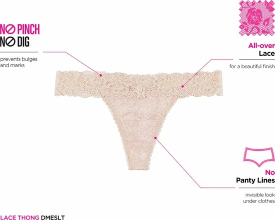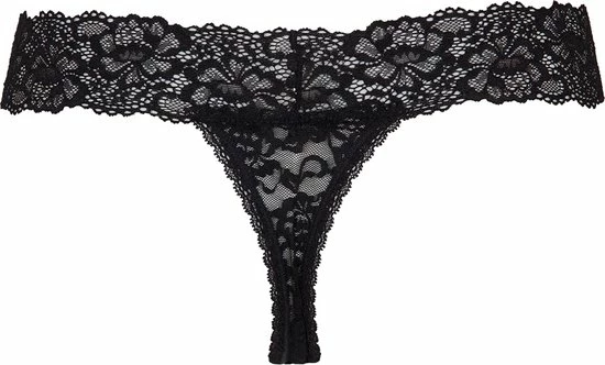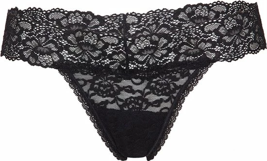 Voor een onzichtbare look onder getailleerde kleding, kiest u deze all-over kanten string. Laag uitgesneden met lichte bedekking aan de voorkant