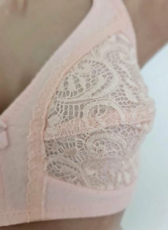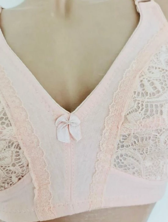 Een mooie hoog gesloten BH met kant. De BH draagt fijn en comfortabel. De BH is niet voorgevormd en heeft geen beugel. De schouderbanden zijn verstelbaar en hebben een 3 haaks sluiting aan de achterkant. Het materiaal is van 65% katoen, 25% polyester en 10% elastaan. Wasbaar met de hand. Op de etiket staat 40-90C, dit model valt naar 90B.