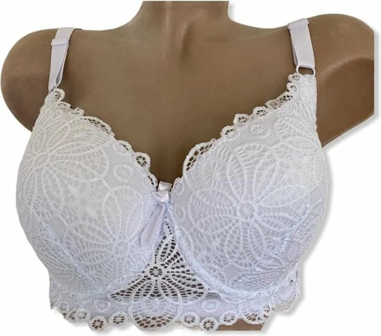 Een mooi voorgevormde bh met beugel en kant. De bh draagt comfortabel en heeft haaksluiting aan de achterkant. De bh heeft verstelbare schouderbandjes. Het materiaal is van 90% polyamide en 10% elastaan. De confectiemaat is 46-48, met volle cupmaat 95D. Wasbaar met de hand.