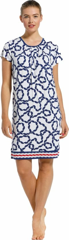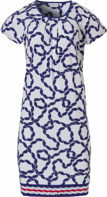 Een stijlvolle dames strandjurk van het merk Pastunette Beach. Deze jurk heeft een doorlopend donker blauw gekleurd kabel patroon. De ronde hals is met een blauwe boord afgewerkt. Gemaakt van 95% viscose en 5% elastane. De lengte is 95cm.