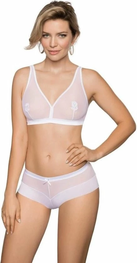 De wit doorzichtige beha is van tule met op de plek van de tepel een kanten bloemetje, waardoor de tepel op een sensuele manier bedekt wordt en daardoor onder kleding niet te zien is.