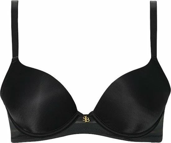 Deze comfortabele push-up BH is in een mysterieuze zwarte kleur. Het model heeft cups van een zachte stof. De band heeft een mesh streep patroon. Tussen de cups is een elegant hangertje aangebracht. Het model heeft schouderbandjes en sluit aan de achterkant.